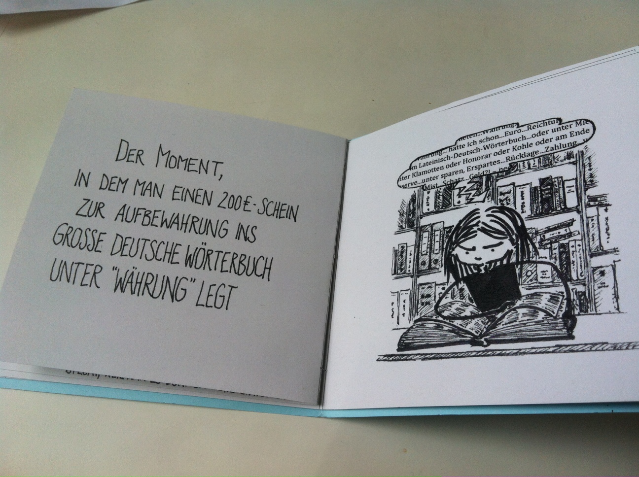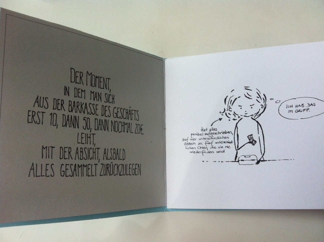 Ich habe vor einiger Zeit aus ein paar hingekritzelten Skizzen einen Blogeintrag gemacht. Jetzt habe ich aus dem Blogeintrag wieder ein kleines Buch gemacht, und zwar so richtig, richtig undigital: Zeichnungen überarbeitet, geklebt, gedruckt, geschnitten und zusammengenäht. Und kam mir vor wie im Volkshochschul-Bastelkurs. (Okay, ein bisschen am Rechner gelayoutet.) Hier ein paar Bilder von meinem ersten Minicomic: